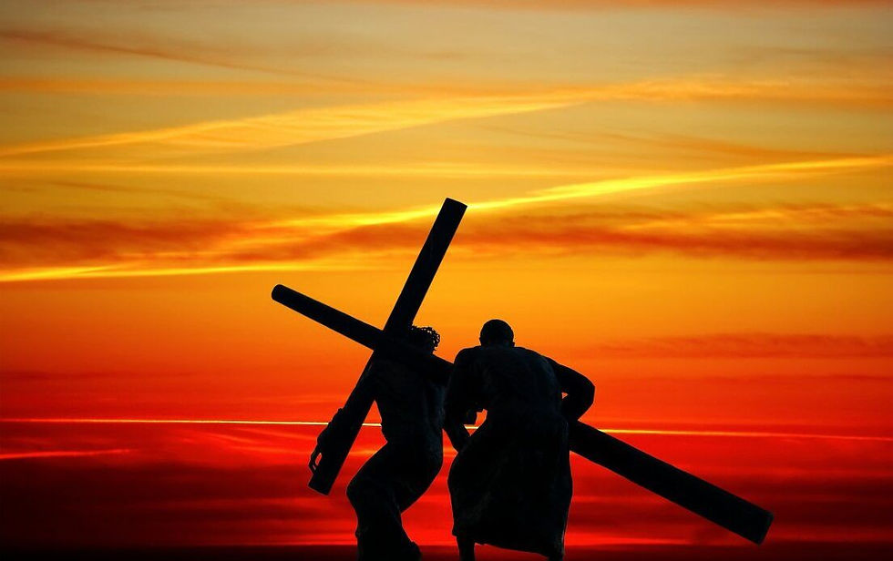 そこへ、アレキサンデルとルポスとの父シモンというクレネ人が、郊外からきて通りかかったので、人々はイエスの十字架を無理に負わせた。そしてイエスをゴルゴタ、その意味は、されこうべ、という所に連れて行った。