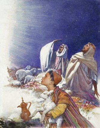 羊たちは真っ暗な野原で眠りについている。数人の羊飼いたちは焚火をして暖をとっていた。すると突然、辺りが明るくなり、ひとりの御使いが姿を現わし、キリストの降誕の知らせを告げた。その直後に、真昼のような明るさが夜空の全面をおおい、おびただしい数の御使いたちが姿を現われ、とどろくような声で神を賛美した。「いと高きところでは、神に栄光があるように、地の上では、み心にかなう人々に平和があるように」。全世界の人々が、神を畏れかしこみ、神のみ心に従うなら、そして、いっさいの栄光を神に帰するなら、人と人とは争うことなく、互いにわかり合えてゆるし合い、平和が訪れるだろう。天に神の栄光があるように、地に平和があるように心から祈りたい。